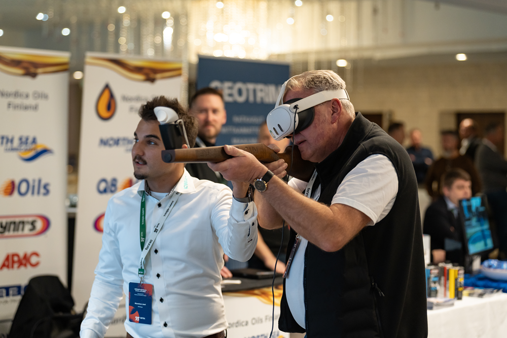 Lauantai-iltapäivänä harrastettiin virtuaalimetsästystä KH-Groupin pisteellä. Tähtäämässä Kari Martikainen.