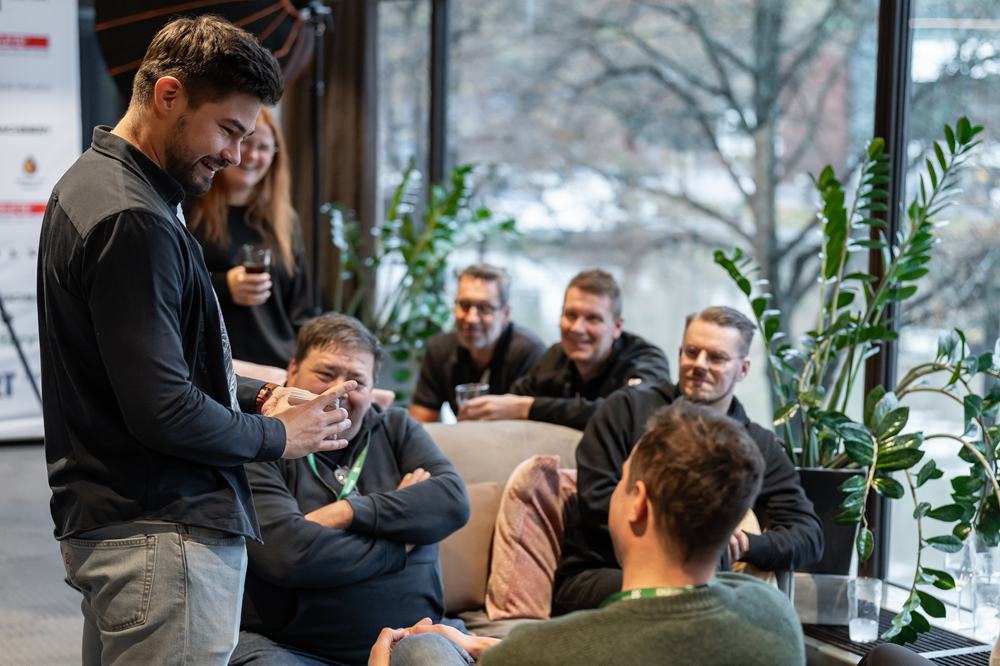Tapahtuman juontaja Marko Poskiparta teki temppujaan jo iltapäivällä saaden infrayrittäjät mykistymään.